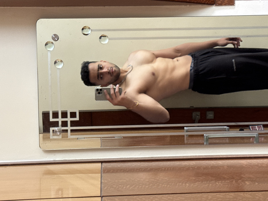 A shirtless man is reflected in a mirror while taking a selfie. He wears dark sweatpants and jewelry including a necklace and bracelet. The mirror has decorative glass orbs and a geometric border. The background shows a light-colored wall and wooden furniture. The overall composition is a casual, self-portrait style image.