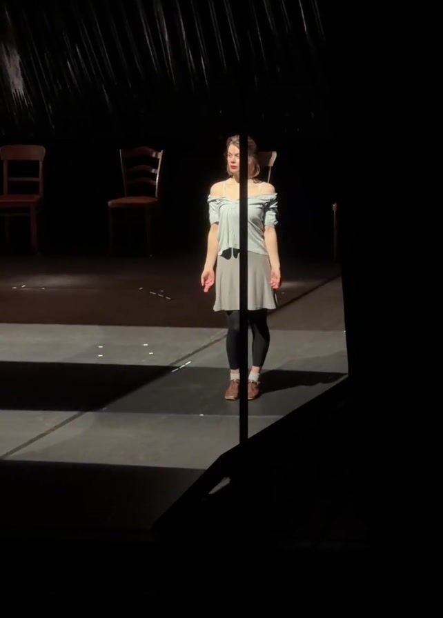 A woman in a light blue off-the-shoulder top, gray skirt, and black leggings stands center stage. She gestures with both hands, palms up. The stage is dark with a single spotlight illuminating her. Behind her are three chairs, and the back of the stage is black. The foreground is dark, obscuring the bottom right of the frame. A heavy, repetitive rhythmic sound plays in the background.