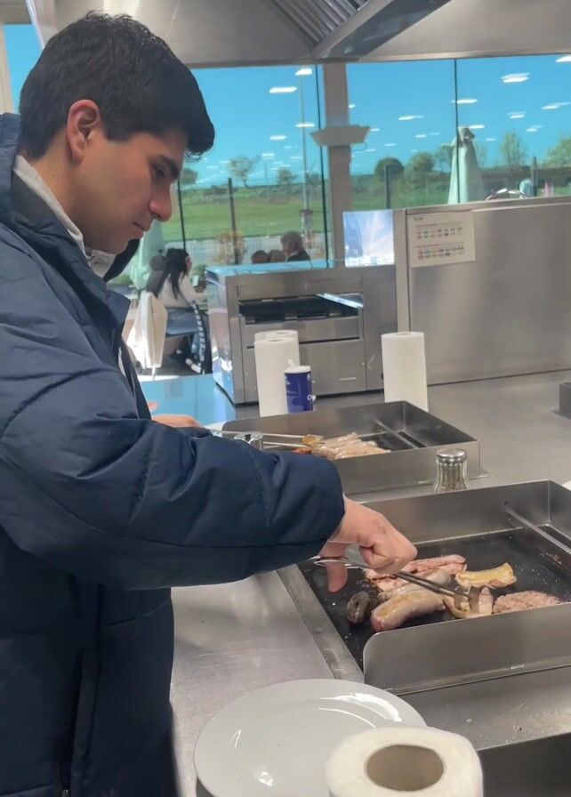 A man with dark hair is grilling various meats and mushrooms on two separate grill stations in a commercial kitchen. He is wearing a navy blue jacket and uses a spatula to handle the food. He pauses to smile at the camera briefly. Behind him is a large window showing an outdoor view of a field and other people. In the background, there is an industrial-style exhaust hood above the grills, along with other kitchen appliances and supplies, including paper towels, condiment shakers, and plates.