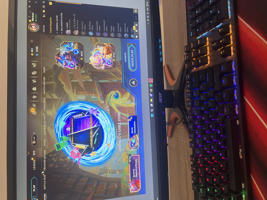 The image displays a close-up, eye-level perspective of a computer workstation. No discernible location data within the image indicates "Montana, Bulgaria." **Subjects and Objects:** The primary objects are a computer monitor and a keyboard, situated on a wooden desk. 1. **Monitor:** An Acer-branded monitor, identified by the logo on its stand, is visible. The monitor stand features black and orange accents with an X-shaped base. The screen displays the main lobby of a video game, likely associated with Riot Games (e.g., League of Legends, Teamfight Tactics, or Legends of Runeterra), indicated by tabs labeled "PLAY," "LEAGUE," "TFT," and "LoR." The central display features a graphic labeled "CHONCC'S CHILL ZONE," surrounded by a blue swirling effect with various characters. Other interface elements include "HOME," "BATTLE PASS," "TREASURE REALMS," "STORE," "LUNAR REVEL 2026," "LOREFINDER," "MATCH HISTORY," and "NEWS." Player information shows a username "Markzzzi" as online, with an in-game level of 3, 201 units of one currency, and 144K units of another. A "Friend Requests" sidebar is active, displaying a list of friends with their online/offline statuses. Game event progress "Revival: Festival of Beasts" and "38/40 Unlockables" are visible, along with a "QUICK PLAY" button. The Windows operating system taskbar is partially visible at the bottom of the monitor, showing icons for applications like search, Spotify, and system tray elements. 2. **Keyboard:** A black, RGB-backlit mechanical gaming keyboard is positioned in the foreground, directly in front of the monitor. The keys are illuminated with varying colors, including red (WASD keys), purple (function and alphabet keys), blue, and orange (number pad and arrow keys). A black cable extends from the top-center of the keyboard towards the monitor stand. 3. **Desk Surface:** The keyboard and monitor rest on a light brown wooden desk surface with a visible grain. A red and black patterned mousepad is partially visible beneath the right side of the keyboard. **Actions and Interactions:** No individuals are visible. The setup suggests the computer is actively in use for gaming, with the user likely poised to interact with the game via the keyboard. **Environment:** The environment consists solely of the desk surface, suggesting an indoor setting typical of a personal computer setup.
