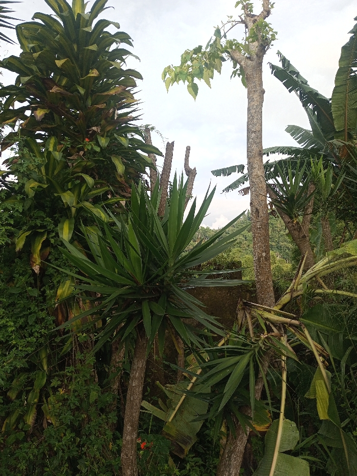 Lush vegetation fills the frame, featuring diverse plants. Tall Dracaena fragrans, a tree with a bare trunk, and banana trees dominate. A yucca plant displays spiky leaves. A low concrete wall is partially obscured by greenery. The background reveals a hilly landscape beneath a cloudy sky. The composition is densely packed, suggesting a wild, uncultivated environment.