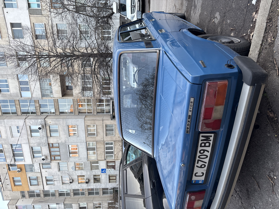 The scene is a paved parking area in Sofia, Bulgaria, located directly in front of a multi-story residential building. A blue Lada 2105 sedan, bearing Bulgarian license plate BG C 6709 BM, occupies the foreground, positioned with its rear facing the camera. Visible components include the trunk lid, "LADA 2105" badging, rectangular taillight assemblies, and a chrome-and-black bumper. To the immediate left of the Lada, the rear quarter of a dark-colored station wagon is partially visible. To the right, a white Mercedes-Benz van equipped with a roof-mounted cargo box is parked, displaying Bulgarian license plate CO 9851 TH. The background is dominated by a large, uniformly gray, multi-story residential building constructed of concrete or stucco, featuring numerous windows, some with white frames and external air conditioning units. The building exhibits signs of varied renovations across its facade. Bare deciduous trees are interspersed between the parked vehicles and the building structure. Reflections of warm, natural light are present on several building windows, suggesting daylight conditions. A blue and white handicapped parking sign is affixed to a pole positioned near the building's base on the left side of the frame. No human figures are present in the image.