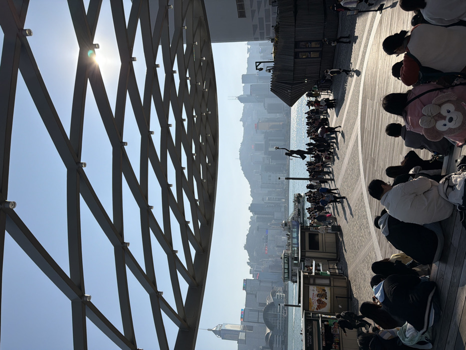 A bustling waterfront scene unfolds beneath a hazy sky. A crowd gathers on a wooden boardwalk, captivated by a performer mid-air, juggling a ball. Behind them, the cityscape rises, skyscrapers piercing the horizon. A large, circular metal structure dominates the left frame, its geometric pattern catching the sunlight. Food kiosks line the right side, catering to the onlookers. The scene captures a vibrant moment of public entertainment against a backdrop of urban grandeur.