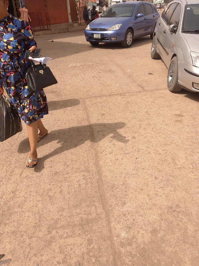 The image displays a daytime street scene in Jos, Nigeria, characterized by direct sunlight and visible shadows. In the foreground, a woman is captured walking from left to right, partially visible. She wears a dark blue dress patterned with floral shapes in blue, yellow, and red, featuring ruffles near the hem. On her feet are light-colored flip-flop sandals with a decorative accent. She carries a black structured handbag with gold-colored hardware on her right arm, and holds a mobile phone along with white papers in her right hand. A crumpled black plastic bag with white stripes is held in her left hand. Her shadow is prominently cast on the ground to her right. The ground surface is light brown, appearing dusty or unpaved, with visible texture. In the midground, a silver Ford Focus hatchback is parked on the right, displaying its front right wheel, bumper, and headlight. Further back, a blue Ford Focus hatchback is positioned, facing the viewer, with a partially visible Nigerian license plate beginning with "JJT." The background features a building with a red-orange door or gate and a window. To the left of the blue vehicle, two mannequins, one pink and one dark-colored, are visible, suggesting a commercial establishment. Blurred human figures are discernible in the distant background near the structures.