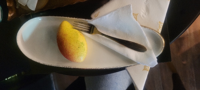 - "A mango sits on a white, elongated plate trimmed with gold, next to a folded white napkin and a fork" by FM-lpZ3r2, licensed under CC BY 4.0