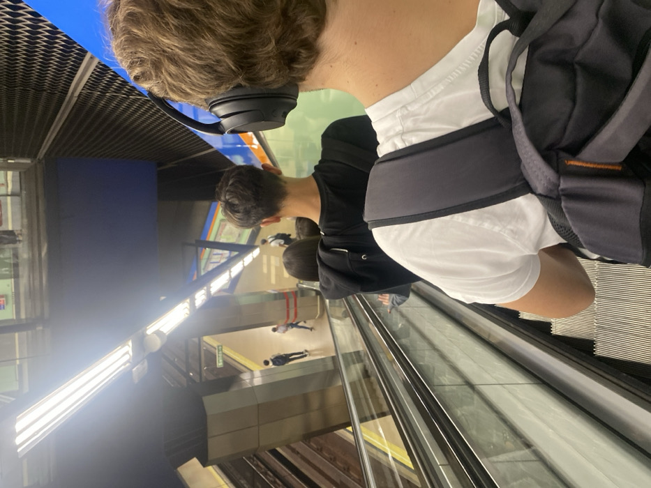 The image depicts an underground metro station, specifically identified as part of the Madrid Metro system in Madrid, Spain, based on visible "Salida-1" (Exit-1) signage and architectural elements. The perspective is from an escalator moving downwards into the station. In the foreground, the back of a person's head and upper torso are visible. This individual has light brown, curly hair and is wearing black over-ear headphones, a white t-shirt, and a dark grey backpack with black straps and a subtle orange accent on one strap. Directly in front, also on the descending escalator, are two individuals. The person immediately ahead has short, dark hair with a faded cut, wears a black t-shirt, and has a dark backpack. To their left, partially obscured, is another person with dark hair, wearing a dark hooded garment. The escalator itself has metal steps, transparent glass side panels, and stainless steel handrails. Further down the escalator and on the station platform below, approximately three to four additional individuals are visible. One person stands on the left side of the platform, dressed in a dark shirt and light-colored shorts, carrying a backpack. Another individual is positioned near a grey vertical pillar on the right side of the platform. The platform floor is light-colored, featuring a yellow tactile strip along its edge. The station environment is well-lit by multiple long, bright fluorescent light fixtures mounted on the dark blue ceiling. Walls feature grey structural pillars, dark grey textured panels (possibly metal grilles) on the right, and segments of blue paneling. A large map or information display is visible on a blue wall section to the right in the mid-distance.