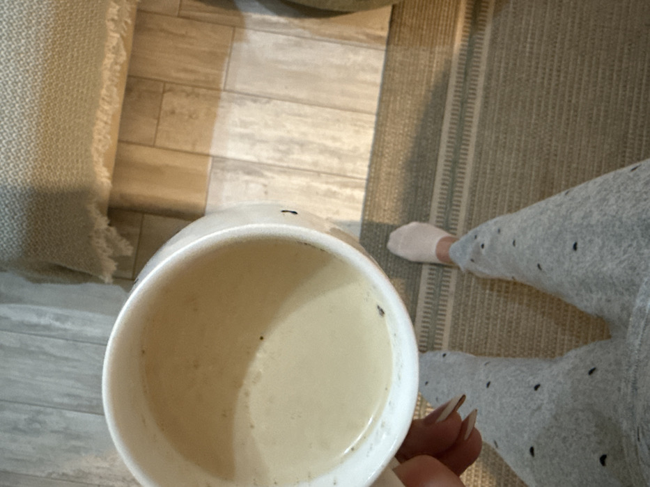 A high-angle view shows a white mug filled with a light-colored liquid, held in a person's hand. The background includes a textured beige cushion, light wood-look flooring, and a striped beige rug. The person wears light gray patterned sweatpants and a white sock. The overall lighting appears soft and natural.