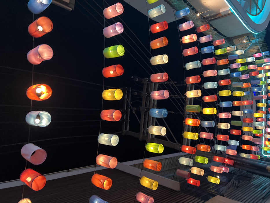 Rows of cylindrical lanterns in various colors illuminate a nighttime scene
