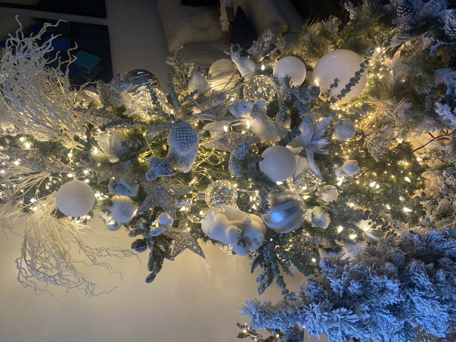 The image displays an indoor domestic setting centered on a large, artificial Christmas tree