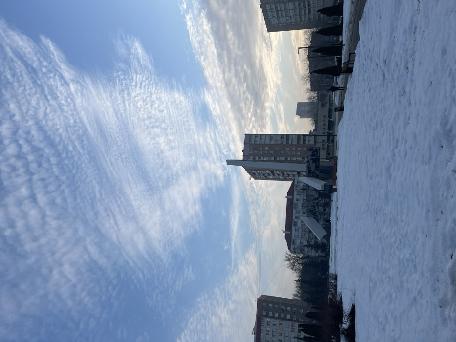 The image depicts a winter scene at Victory Square (Площадь Победы) in Podolsk, Russia, specifically showing the Monument to Podolsk Cadets (Па́мятник Подольским курсантам). The ground is extensively covered in uneven white snow across the foreground and midground. The sky occupies the upper two-thirds of the frame, displaying a light blue hue with numerous thin, wavy white clouds, likely cirrocumulus or altocumulus, extending horizontally across the expanse. Towards the right horizon, the sky transitions to a lighter, hazy pale yellow-orange. In the midground, the central subject is the Monument to Podolsk Cadets. It features a tall, slender, light-colored obelisk-like structure rising vertically from a darker, multi-faceted base. Several large, angular white slab-like elements extend outwards from this base, some appearing to be supported by darker structures or containing relief sculptures. To the left of the monument, a multi-story residential building with a brown-reddish facade and numerous windows is visible. Another similar, taller residential building stands behind the monument, slightly to the right. A third multi-story residential building is partially visible on the far right. Between the monument and the left building, a lower, white-walled building with a red roof is discernible. Bare trees and dark evergreen bushes are scattered throughout the scene, particularly behind the monument and to its left. A cleared pathway, free of snow, runs from the right midground towards the left, passing several dark-colored park benches. A single individual, dressed in dark attire, walks along this pathway in the right midground, moving away from the camera. Several dark, modern-style streetlights are positioned along the pathway. The overall lighting suggests late afternoon or early morning, with a soft, diffused light.
