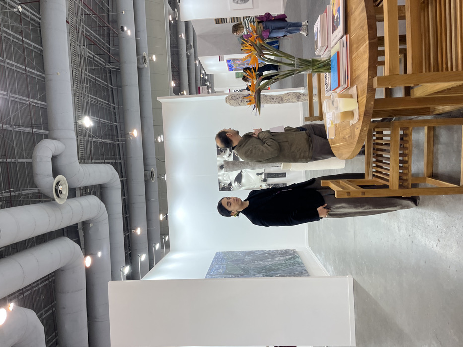 Inside an art exhibit hall, a woman in a black coat and gray pants stands near a white wall, looking at art. Nearby, a man in a green jacket also views artwork on a white wall. Above, industrial piping covers the ceiling. An orange bird of paradise flowers in a vase sits on a round wooden table with chairs. Other visitors can be seen in the background.