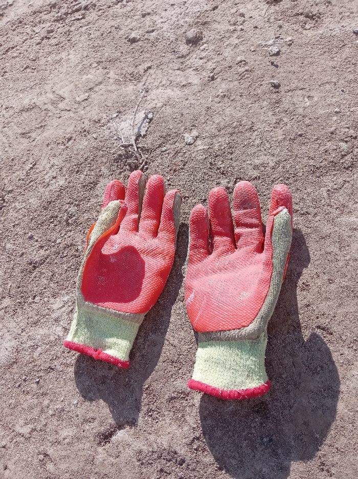 - "The scene depicts a pair of red and light-green work gloves lying on a dry, light-brown, granular ground surface in Chimbay, Uzbekistan" by FM-oyrGI2, licensed under CC BY 4.0
