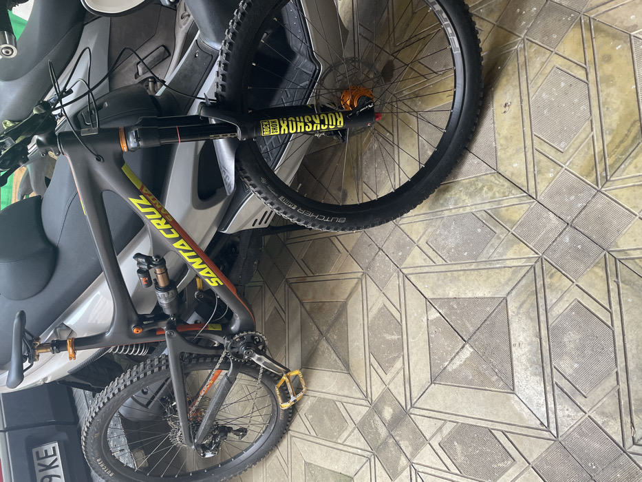 - "A dark grey Santa Cruz full-suspension mountain bike with prominent yellow and orange branding accents is stationary on textured light-colored pavement, which displays a repeating geometric pattern of interlocking squares and diamonds" by FM-gE0tT2, licensed under CC BY 4.0