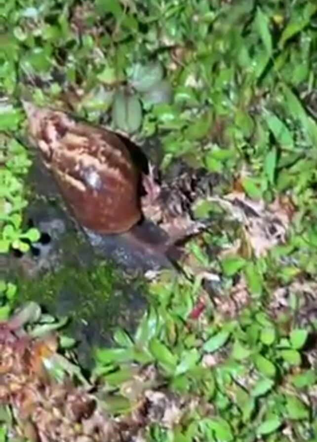 snail, with a brown and tan striped shell, crawling on a mossy surface surrounded by small green plants