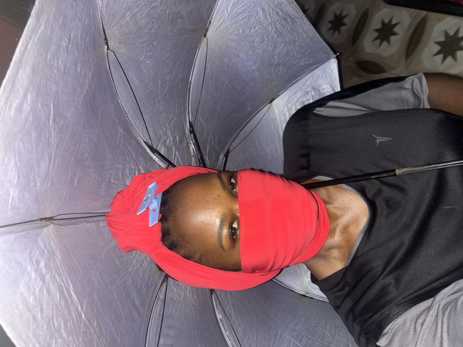 A person is angled to the left, with a red cloth covering their face except for the eyes. They are under a large, open, silver umbrella. A small blue ribbon adorns the cloth covering their head. The person is wearing a gray shirt underneath a black athletic shirt with a white logo. The floor behind the umbrella has a star-shaped tile design.