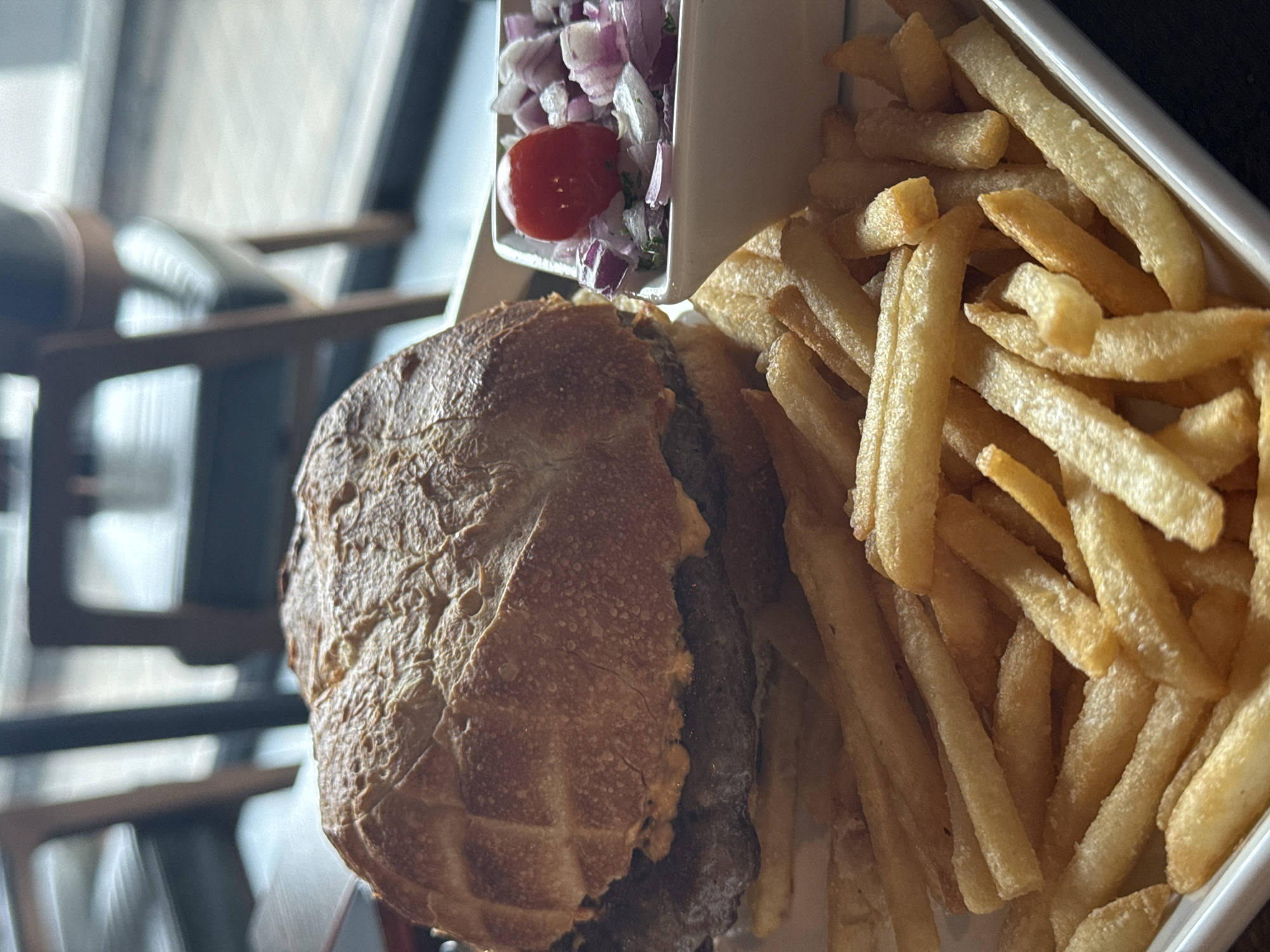 A close-up shot of a burger, fries, and a small container of chopped red onions with a single cherry tomato, served on a white plate. The burger has a crusty bun and a visible patty. The fries are golden brown and appear to be thin-cut. The items suggest a meal in a restaurant setting. The location is Willowbrook, United States of America. The time of day is daytime, suggested by the light from the nearby window. There are wooden chairs and window framing in the background, further indicating an indoor dining location. There are no people visible.