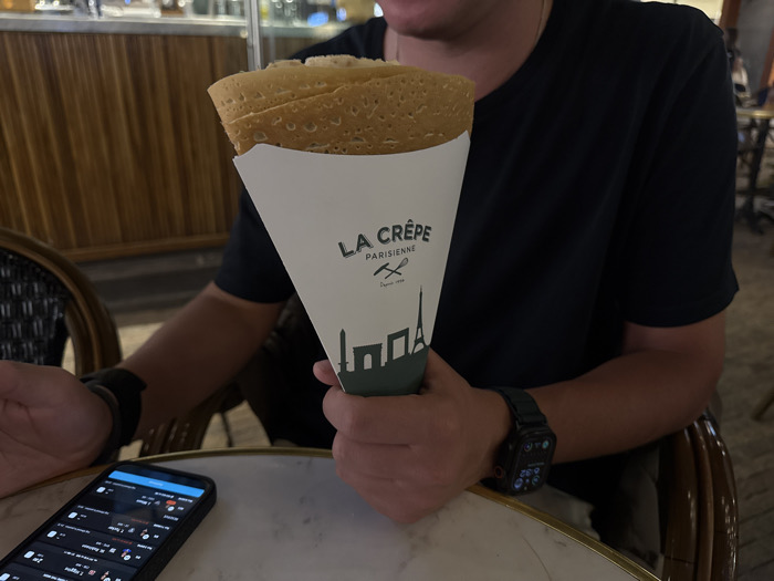 An individual is depicted seated at a round, white-topped table with a gold-colored edge, in what appears to be an indoor or semi-outdoor café setting. The person, whose lower face (chin and mouth area) and torso are visible, is wearing a dark short-sleeved t-shirt. Their right hand holds a golden-brown crepe, folded into a conical shape, inside a white paper holder. The holder bears the branding "LA CRÊPE PARISIENNE" in dark green, accompanied by a logo featuring a fork and knife, a stylized Eiffel Tower, and "Depuis 1998". A light-colored filling is visible at the top of the crepe. The person's left hand rests on the table beside a black smartphone, possibly an iPhone, displaying an illuminated screen with a dark interface featuring what appear to be sports scores or betting lines. A dark smartwatch is visible on the person's left wrist, and a more robust, dark smartwatch (resembling an Apple Watch Ultra) is on the right wrist. In the blurred background, a woven café chair back is partially visible to the left, and further back, a warm-toned, vertically paneled wooden wall or counter is present, indicating an establishment. The specific establishment is "La Crêpe Parisienne", which has a known location at Plaza de Armas, Andador 5 de Mayo #40 Int 1, Centro Histórico, 76000 Santiago de Querétaro, Querétaro, Mexico. The lighting suggests an evening or indoor ambiance.