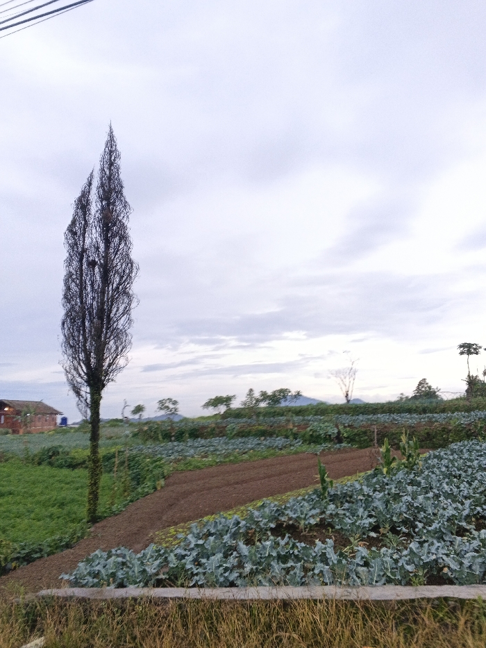 The image displays an agricultural landscape, located in the city of Khan Boeng Keng Kang, Cambodia. In the immediate foreground, a strip of dry, light brown grass is visible, partially obscured by a low concrete or stone barrier. A tall, slender, dark brown tree with sparse, wiry branches dominates the left midground, extending nearly the full height of the frame. To the left of this tree, a cultivated area of vibrant green, low-lying crops is present. The central and right midground features tiered fields of various crops. The lower tiers predominantly display rows of green-blue leafy plants, consistent with young cabbage or broccoli. Adjacent sections show dark brown, freshly tilled earth in prepared rows, and additional patches of green vegetation further back. In the distant left, a two-story building with reddish-brown walls and a dark roof is partially visible amidst greenery. The background consists of hazy, undulating terrain or distant hills, dotted with various trees, some appearing bare. The sky is largely overcast, displaying a gradient of light grey and white clouds. Two dark, parallel lines, likely power lines, are visible in the upper left quadrant of the sky. No human figures or animals are present, and no discernible actions or interactions are depicted. The overall lighting is soft and diffused.