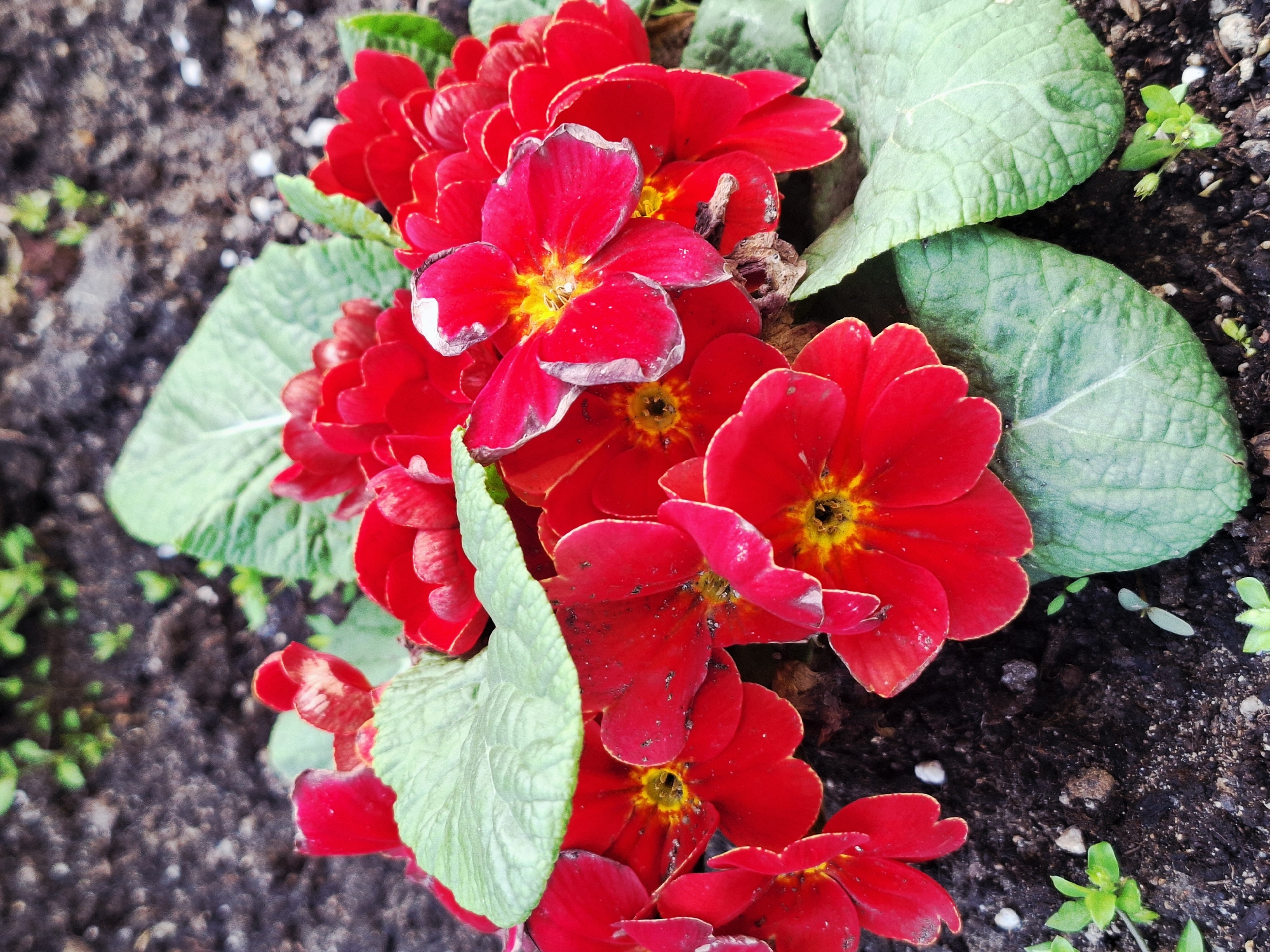 A close-up, high-angle shot shows a cluster of red primrose flowers with green leaves amidst dark soil. The flowers have a vibrant red color with yellow centers. Some flower petals have a slight fading or discoloration. The leaves are textured with visible veins. The soil is dark and moist. A few small green plants are growing among the soil. The location is not discernible from the image.