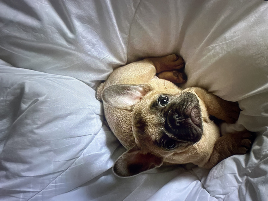 - "The image displays a fawn-colored French Bulldog puppy positioned on a surface of white, crumpled fabric" by FM-rbaW33, licensed under CC BY 4.0
