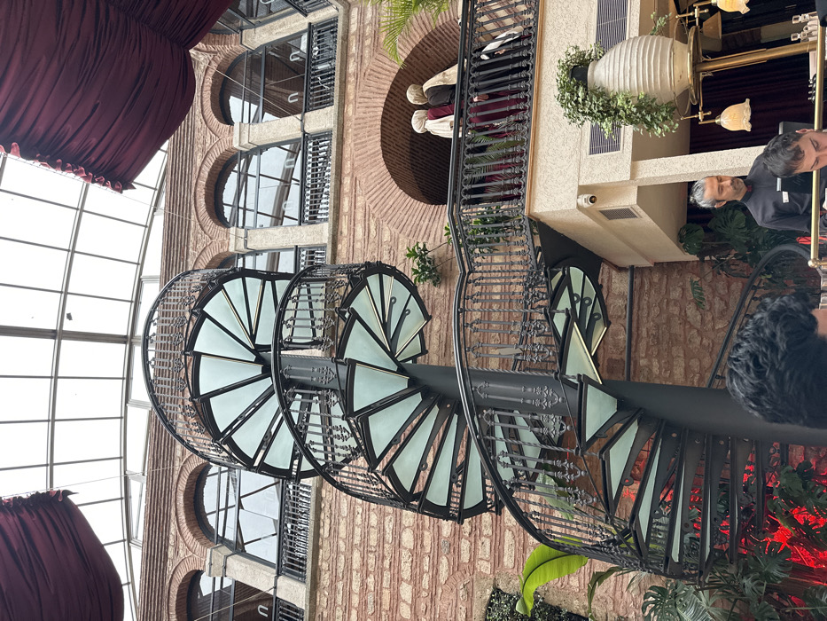 The image depicts the interior courtyard of Han-ı Medrese, a repurposed historical building in the Fatih district of Istanbul, Turkey. A prominent black metal spiral staircase, featuring ornate railings and light-colored, translucent triangular steps, ascends from the lower left to the upper right. The building's walls are constructed from exposed reddish-brown brick, characterized by arched windows on upper levels and arched openings below. A modern, multi-paneled glass ceiling covers the courtyard, providing ambient natural light. Dark red fabric drapes are visible at the upper edges of the frame. On a second-story balcony to the right of the staircase, two women and a partially visible third person stand with their backs to the viewer, observing the left side of the courtyard. Both visible women wear modest clothing and hijabs; one is in dark red, the other in a darker shade. The balcony's railing is black wrought iron, matching the staircase design. Below the balcony, a white security camera is mounted on the wall. At the ground level, a male staff member with a gray ponytail and beard, wearing a black uniform, stands to the right. The top of a person's dark, curly head is visible in the extreme foreground, bottom left, with another partially visible head next to the staff member. Green foliage, including large-leafed plants and cascading ivy, is interspersed throughout the space. Red accent lighting illuminates plants on the lower left, and a decorative gold-toned lamp fixture is partially visible on the lower right.