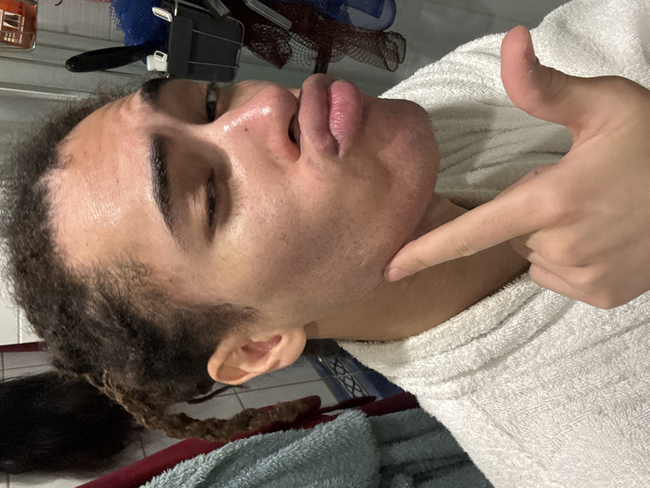 A close-up photograph depicts an individual indoors, identified as being in the city of Les Ulis, France, specifically within a bathroom environment. The subject is a person with medium-toned skin and dark, textured hair styled in dreadlocks or braids, visible on the head and partially hanging down the left side. They are wearing a white, textured terry cloth bathrobe. The subject's face is oriented towards the camera, featuring an expression with pouted lips, a partially closed right eye (subject's left), and a narrowed left eye (subject's right). The subject's right hand is raised, with the index finger extended to make contact with the skin on the right side of their jawline, near the angle of the mandible. Light stubble is discernible on the subject's jawline and chin. The background consists of white ceramic wall tiles, with a horizontal decorative band of blue and white patterned tiles at mid-height. To the viewer's left, a teal-colored terry cloth towel hangs, partially obscuring a red garment or towel. To the viewer's right, a wall-mounted metallic shower caddy is attached to the tiles, holding a red plastic bottle, a dark blue mesh bath pouf, and a black-handled brush. The scene is illuminated by an artificial light source, casting highlights on the subject's skin.