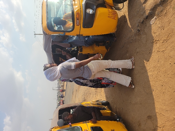 A medium shot shows a man in a gray shirt, white pants, and sandals standing in front of a yellow motorized rickshaw, with another yellow motorized rickshaw in the lower left corner