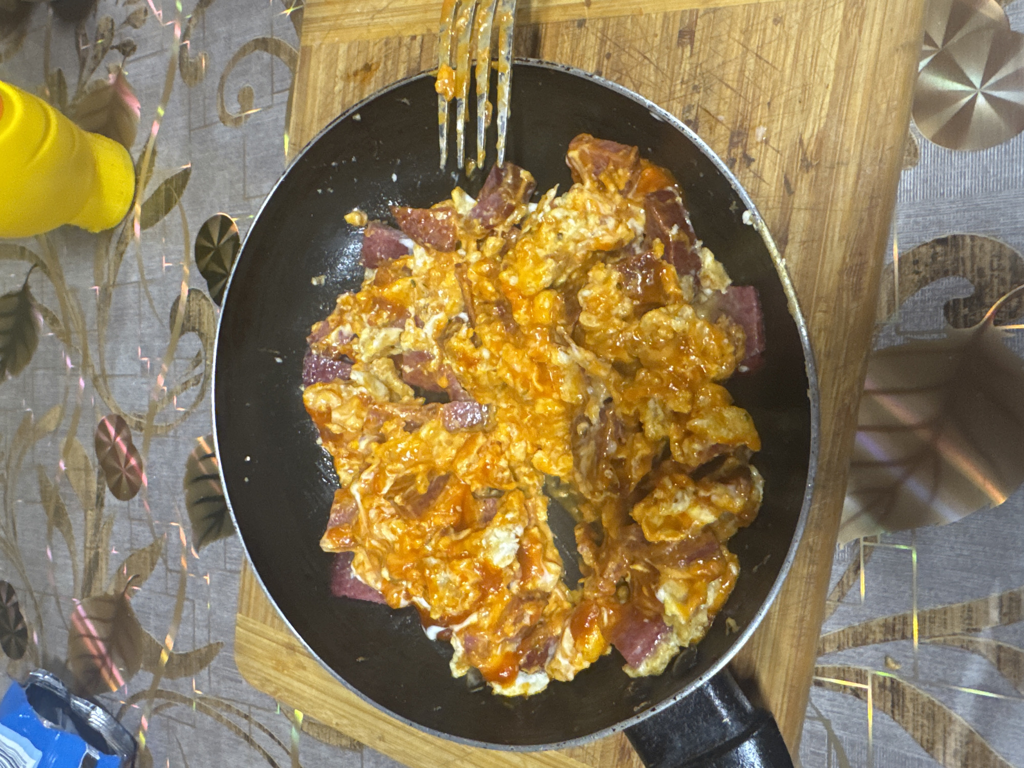 frying pan containing scrambled eggs and sausage. A fork is in the pan. The pan is on a wooden cutting board, which is on a tablecloth with a floral pattern. A yellow bottle is visible in the top left of the image. A blue can is at the bottom left. The specific location in Dryanovo, Bulgaria cannot be determined from the image.