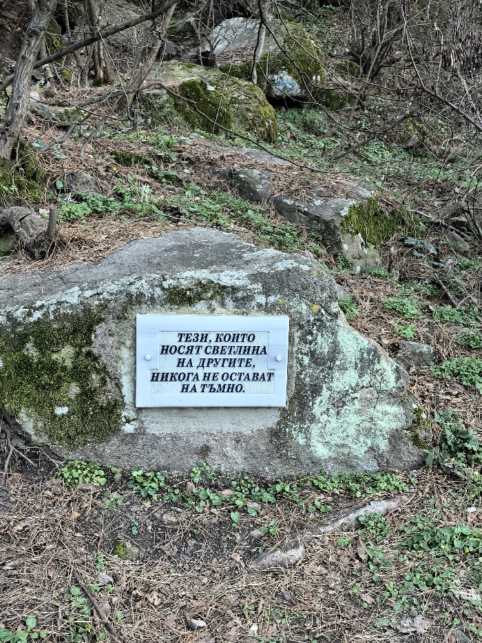 The image displays a white rectangular sign affixed to a large, grey, moss-covered boulder in a natural, rocky, and forested area within the city of Pazardzhik, Bulgaria. The sign is secured to the rock with two visible circular fasteners in its upper corners. Printed on the sign in black Cyrillic capital letters is the text: "ТЕЗИ, КОИТО НОСЯТ СВЕТЛИНА НА ДРУГИТЕ, НИКОГА НЕ ОСТАВАТ НА ТЪМНО." This translates to "Those who carry light for others never remain in darkness." The boulder itself is irregular in shape, with extensive patches of light green moss and some pale lichen covering its surface. The ground in the immediate foreground is composed of a mixture of dry leaves, pine needles, and small, scattered green groundcover plants. The background and midground reveal an upward-sloping terrain, characterized by additional moss-covered rocks and a dense arrangement of bare-branched trees and shrubs, suggesting a dormant seasonal state. The scene is illuminated by diffuse natural light, and no individuals or animals are present.
