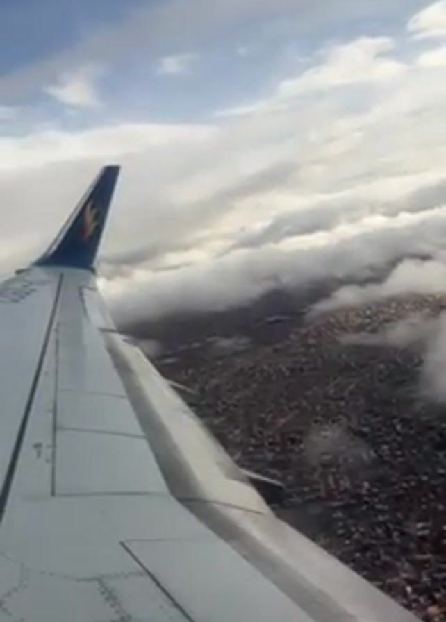 The video presents an aerial view from an airplane