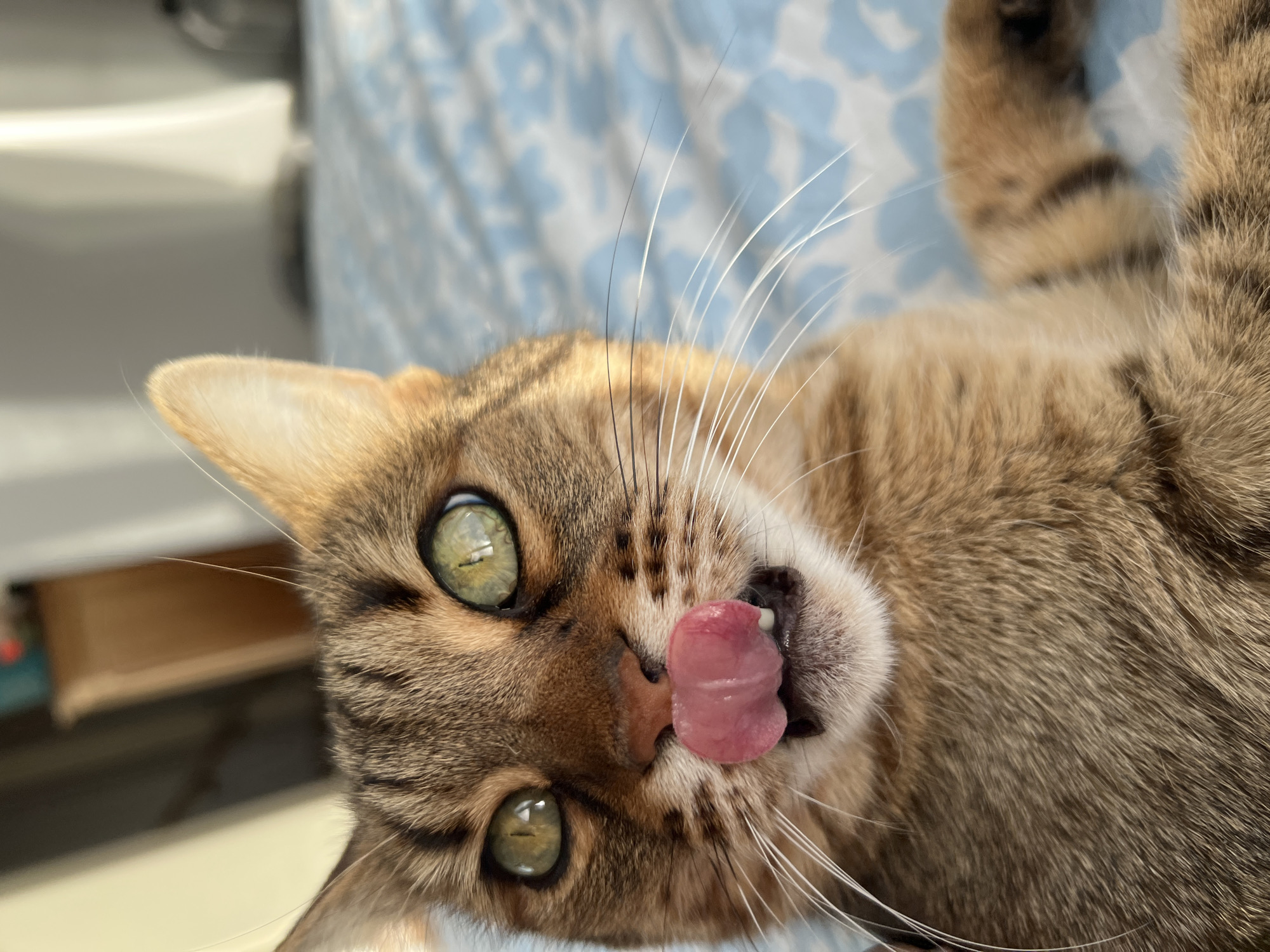 A close-up photograph shows a tan tabby cat with green eyes lying on its back on a bed. The cat's tongue is sticking out. The background is a blue and white floral patterned bedsheet. A portion of a room can be seen in the background. The photograph was likely taken indoors. The location and city of Beverwijk, Netherlands cannot be confirmed from the image.