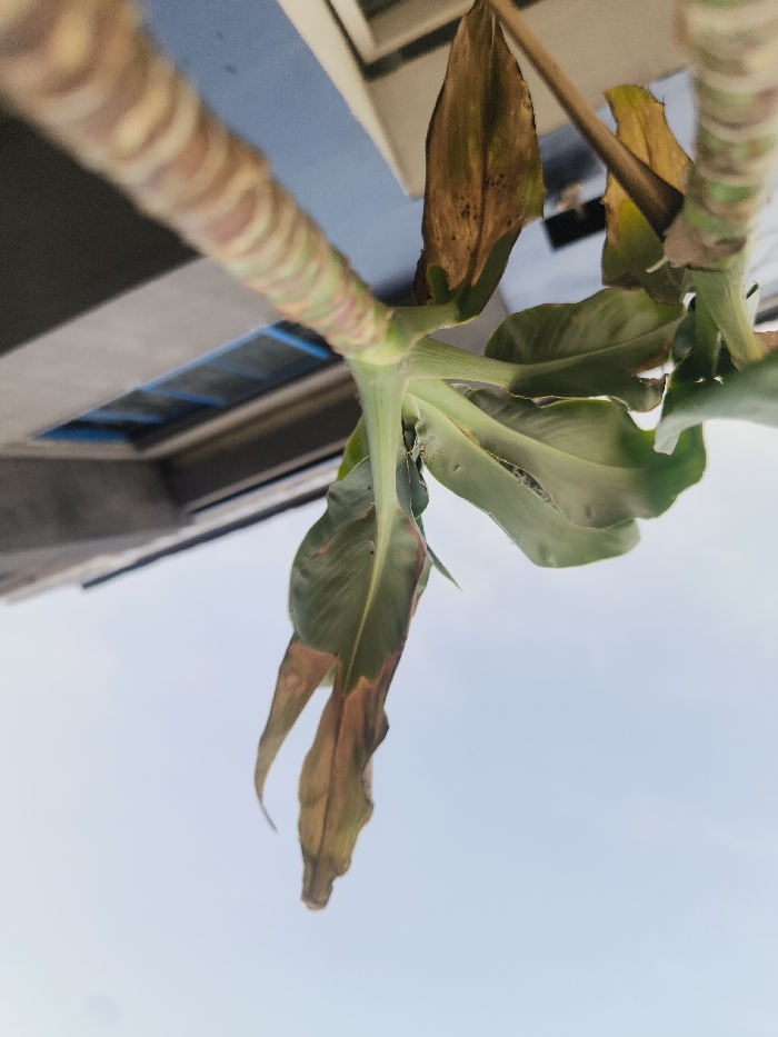 The image is inverted, presenting an upward perspective of a plant in Jos, Nigeria. A thick plant stem, characterized by distinct light and reddish-brown horizontal banding, traverses the upper central area. Multiple broad leaves extend from this stem; several display green pigmentation, while others exhibit significant brown desiccation, particularly at the tips and edges, some also showing minor perforations. In the upper left quadrant, a portion of a building structure is visible, featuring a grey surface and a horizontal rectangular recess containing a light blue, reflective element. The predominant background is a clear, uniform light blue sky. No individuals or specific activities are observable within the frame.