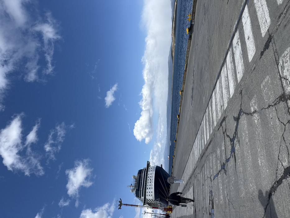 A sideways view features a large cruise ship docked at a pier under a sunny sky with scattered clouds. The pier's surface is cracked and marked with white lines. A shoreline is visible in the background. The photograph appears to be taken during the daytime. People walking along the pier are visible, adding a sense of scale to the large cruise ship.