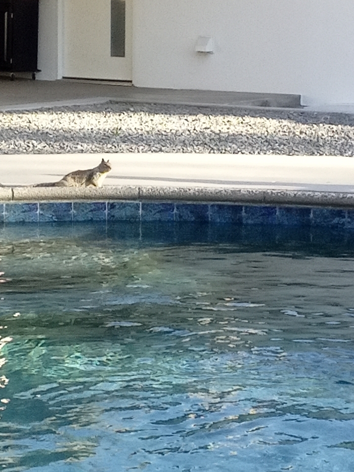 The scene depicts an outdoor residential area in Los Angeles, United States of America, under bright sunlight. The foreground features a swimming pool with turquoise-blue water exhibiting surface ripples and light reflections. The pool's perimeter includes blue mosaic tiles at the waterline and a light-colored concrete coping. A small, light brown and grey squirrel is situated on the concrete deck adjacent to the pool coping, facing right with its body lowered. Beyond the deck, an area covered with light-colored gravel is visible. The background consists of a minimalist white building wall. A dark door frame is partially visible on the far left of the wall, and a white rectangular vent cover is affixed to the wall on the right. No human subjects are present.