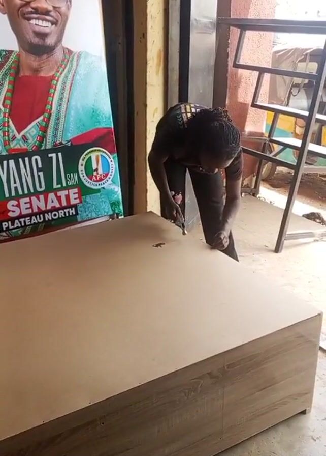 A woman in dark clothing hammers a nail into a large, light-brown wooden box indoors. A political poster featuring a smiling man in traditional attire is visible on the left side of the frame. A metal shelving unit is in the background. The woman bends over the box to reach the nail, striking it repeatedly with the hammer.
