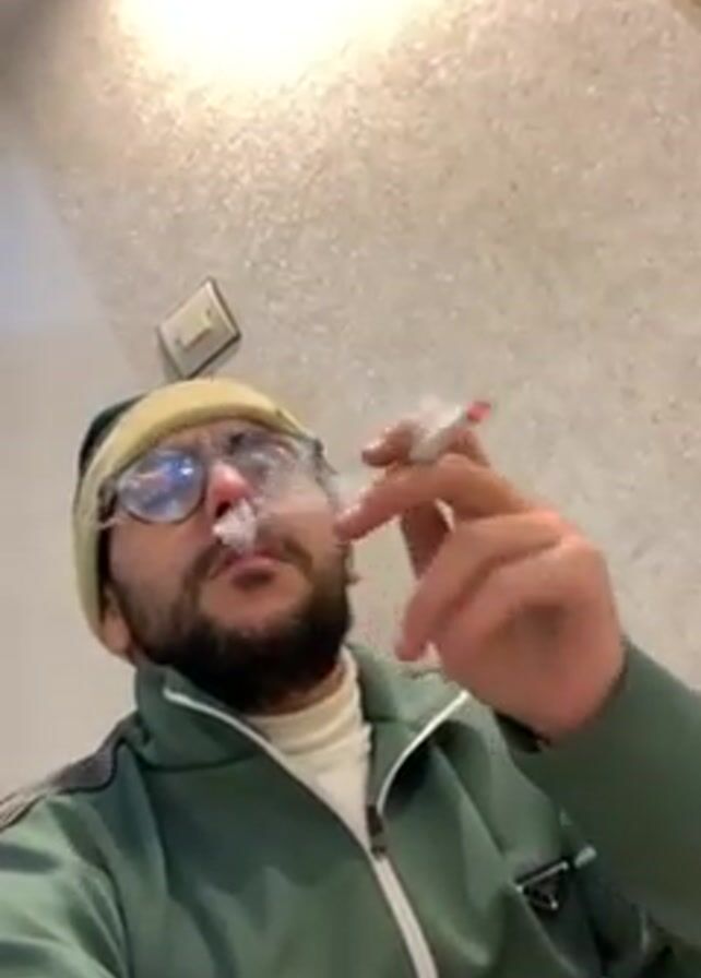 A man with a beard wearing glasses, a white turtleneck sweater, a green track jacket, and a beanie is smoking a cigarette. The camera is positioned below him looking up. He is holding the cigarette with his right hand, and smoke is rising around his face. The background consists of a textured, off-white wall with an electrical outlet and a partially visible wooden structure in the upper right corner. Music can be heard playing.
