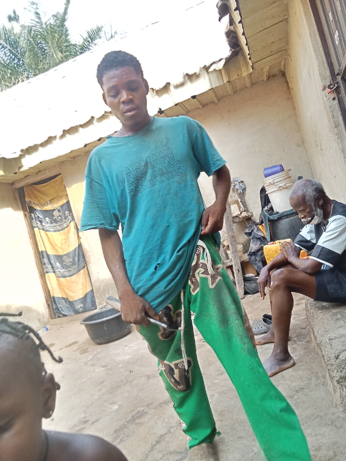 Outdoors, a young man in a blue t-shirt and green patterned pants adjusts his pants with a tool. Behind him, an elderly man with a white beard sits on a step, deep in thought, with a yellow container nearby. A young child's head appears in the foreground. In the background, there's a doorway with a striped curtain, a bucket, and various household items. The setting suggests a simple, perhaps rural, environment.