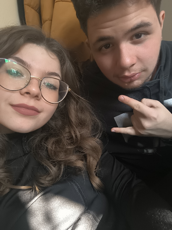 This image depicts two young adults, a female and a male, positioned closely together, likely in an indoor setting in Pernik, Bulgaria