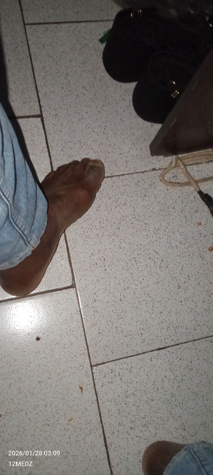 A bare brown foot rests on a light tile floor, partially obscured by a jean-clad leg