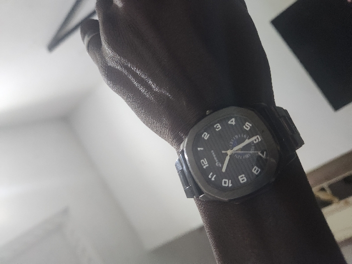 An overhead, slightly angled photograph captures the left forearm and hand of an individual, exhibiting dark skin tones, wearing a metallic wristwatch