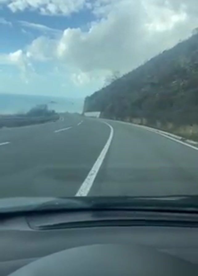 The video depicts a car's point of view while driving along a coastal highway on a partially cloudy day