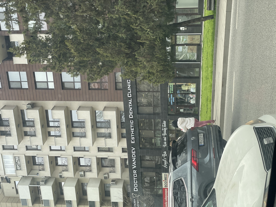 The image depicts a street scene at Vasil Aprilov Blvd 20, Plovdiv, Bulgaria. A multi-story urban building dominates the background, featuring two distinct architectural styles: a lighter-colored section on the left with numerous staggered balconies adorned with black wrought-iron railings and visible air conditioning units, and a darker, brown-paneled section on the right with uniform rectangular windows. The ground floor of the building, characterized by a dark façade, houses commercial establishments. A prominent sign reads "DOCTOR VANDEV ESTHETIC DENTAL CLINIC." Below this, smaller signs identify "Angel's Bar" and "Hair and Beauty Studio." Another shop displays clothing items and features a partial Bulgarian sign indicating "Gifts, Car parts & Accessories." To the far right, a shopfront has obscured windows. A large, dense green coniferous tree stands on the sidewalk, partially obscuring the right side of the building and some of the ground-floor businesses. A strip of green grass separates the sidewalk from the building. In the foreground, an asphalt road with white markings is visible. A grey Volkswagen Tiguan SUV, bearing Bulgarian license plate PB 6320 XP, is positioned on the road, its rear facing the viewer. The front hood and grille of a white vehicle are present in the immediate foreground, suggesting the image was captured from within a vehicle. One individual is visible on the concrete sidewalk, standing behind the grey SUV. This person is wearing a white jacket and pink trousers, and appears to be looking down at an object in their hands. The overall lighting suggests an overcast or neutral daytime condition.