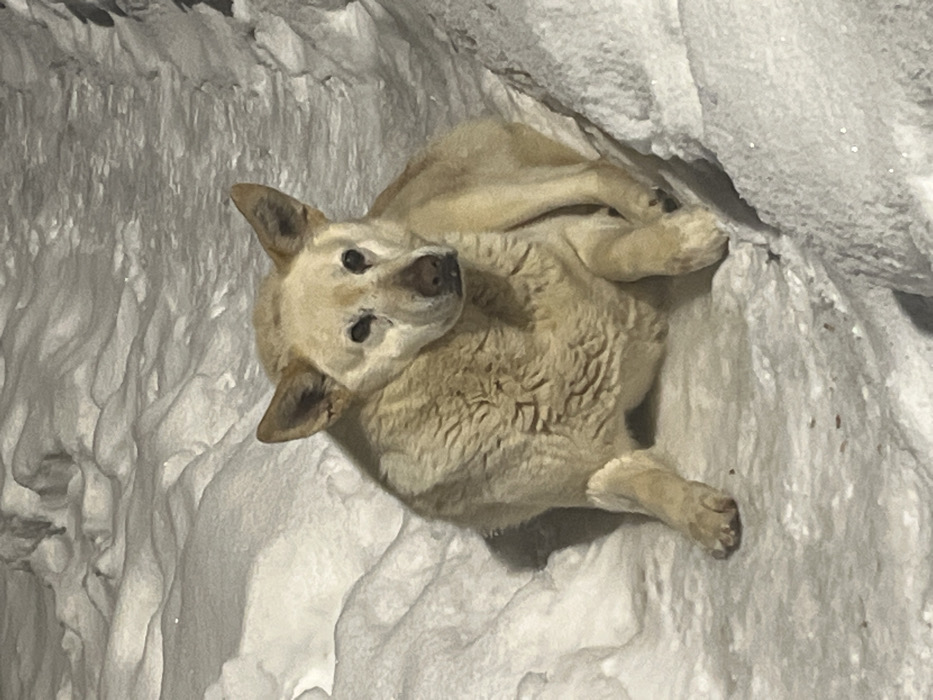 - "A light-colored, medium-sized dog is situated in a snow-covered outdoor environment, identified as the city of Раздолье, Russia" by FM-uf9rE3, licensed under CC BY 4.0