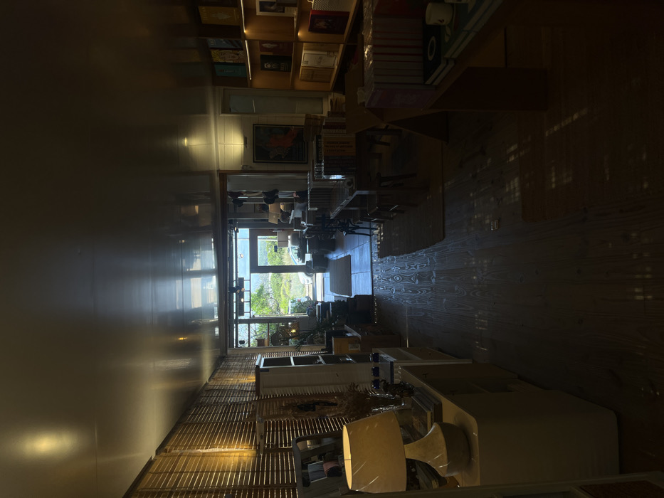 long, narrow room with light streaming in from a door at the far end, revealing a view of greenery. Bookshelves line the upper walls of the room, filled with books. Several tables and chairs are situated in the middle of the room. The floor is dark wood and patterned. A lamp and furniture are visible in the foreground. The room seems to be either a bookstore or a library.
