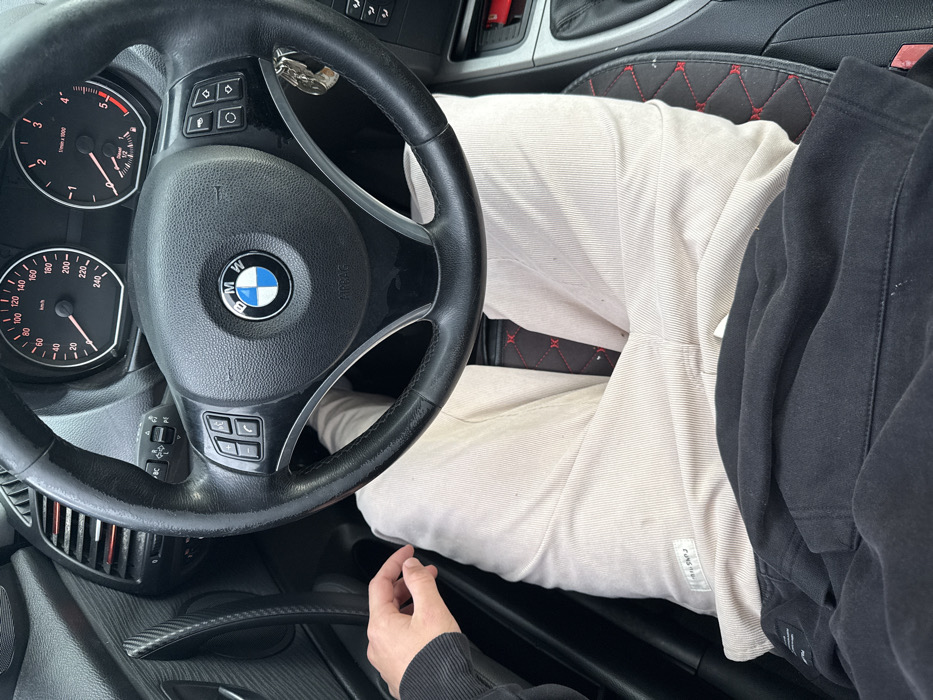 The image depicts the interior of a BMW vehicle, set in Chantepie, France, showing a partial overhead view of the driver's seating area. The lower torso and left hand of an individual are visible. The person is wearing light-colored, vertically ribbed trousers or shorts, with a dark belt featuring a repeating "H" pattern. A dark long-sleeved garment is draped across their lap. The left hand, adorned with a dark cuff, rests on the left thigh. The central focus is the black leather-wrapped steering wheel, prominently featuring the BMW logo and integrated multi-function controls. A car key with multiple buttons hangs from the right side of the steering column. Beyond the steering wheel, the instrument cluster is visible, displaying a speedometer marked up to 240 km/h and a tachometer up to 7000 RPM. The driver's seat is covered by a black quilted seat protector with red diamond stitching. A portion of the left door panel, featuring a black trim with a carbon-fiber-like pattern on the door pull, is visible on the far left. On the right, a section of the center console and shifter is discernible.