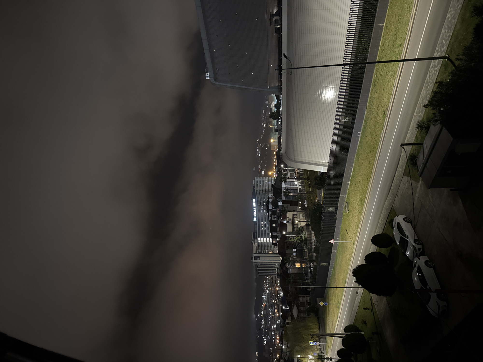 The image depicts a nighttime urban landscape in Sirius, Russia, confirmed by the illuminated "DELTA SIRIUS" signage on a prominent building in the background. The scene is under a dark, heavily overcast sky, with no celestial objects visible. In the immediate foreground, two white, modern sedan-style cars are parked on a dark paved surface. Adjacent to this, a two-lane asphalt road runs horizontally across the frame, marked with a white dashed center line and solid white shoulder lines. Green grass verges line both sides of the road, illuminated by artificial streetlights. On the left verge, a small, dark quadruped animal, possibly a cat or small dog, is present. Various traffic signs are visible along the road, including a blue square sign with a white arrow, a yellow diamond-shaped warning sign, and a red triangular warning sign. A tall, black lamppost stands on the right side of the road. Beyond the road on the right, a dark metal fence separates the road from a large, modern building with a light-colored, paneled facade and a curved roofline. This building is partially lit, revealing a grid-like pattern on its upper section. On the left, past the road and verge, several detached residential-style buildings with illuminated windows are visible amidst trees and foliage. In the mid-ground, a multi-story, modern building displays "DELTA SIRIUS" in large, illuminated blue letters. This building exhibits numerous illuminated windows. Further into the background, the lights of a sprawling city extend across what appears to be a hilly or mountainous terrain, fading into the dark, cloudy horizon. No people are visible.