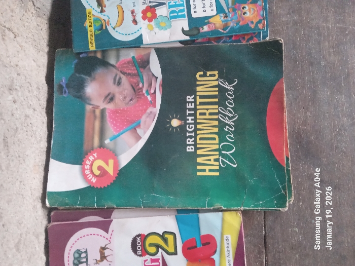 stack of children's workbooks. The top workbook is a revised edition reading book with cartoon characters and letters. Below it is a "Brighter Handwriting Workbook" for nursery 2, featuring a young girl drawing. The bottom book is partially visible with the number 2 and the word "Book". The image also contains a watermark indicating it was taken with a Samsung Galaxy A04e on January 19, 2026.