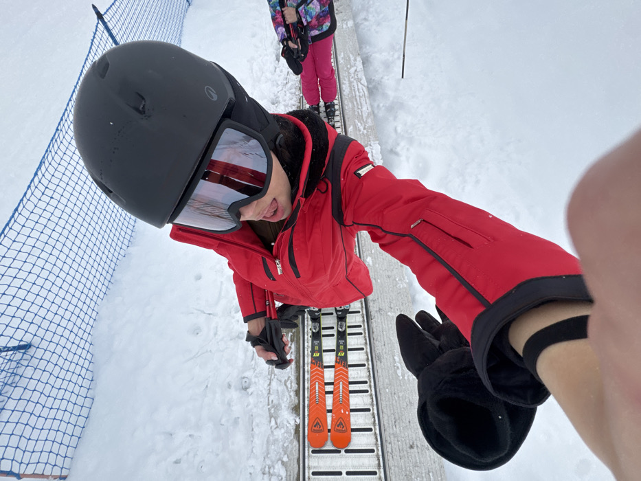 The image depicts a first-person, downward-angled view of skiers at a snow-covered ski slope in Ayas, Italy. In the center, a person wearing a black ski helmet, reflective goggles, a red ski jacket, and red ski pants is positioned on a conveyor belt ski lift, holding two ski poles. Their orange skis are visible on the conveyor belt. The person's mouth is slightly open. To the right, partially visible, is another individual in pink ski attire on the same conveyor belt. The foreground shows a bare arm and a black gloved hand, belonging to the person holding the camera. The background consists of a snow-covered slope and a blue safety net running parallel to the conveyor belt. The ground is uniformly white with fresh snow.