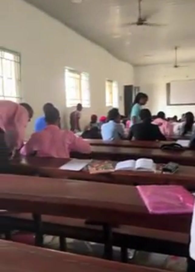 classroom setting. Several students are seated at desks, facing a whiteboard at the front of the room. A person stands near the whiteboard, possibly instructing the class. The room is well-lit with white walls and ceiling, and the desks appear to be made of wood. A ceiling fan is visible. The camera perspective shifts, showing a phone on the desk, along with a pair of shoes worn by the person holding the camera. The camera continues to move through the classroom, capturing other students in various states of attentiveness. One student is wearing headphones.