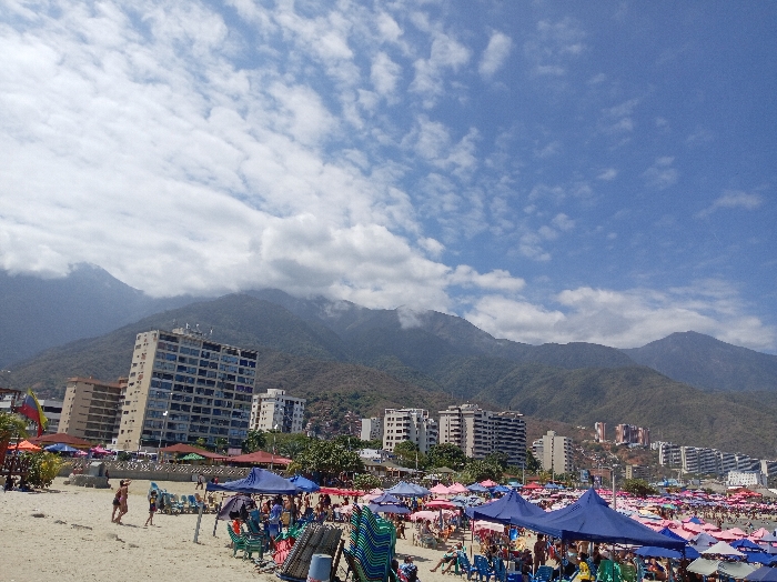 - "The image depicts a crowded beach in Caraballeda, Venezuela, under a partly cloudy sky with prominent mountains in the background" by FM-I9zNR2, licensed under CC BY 4.0